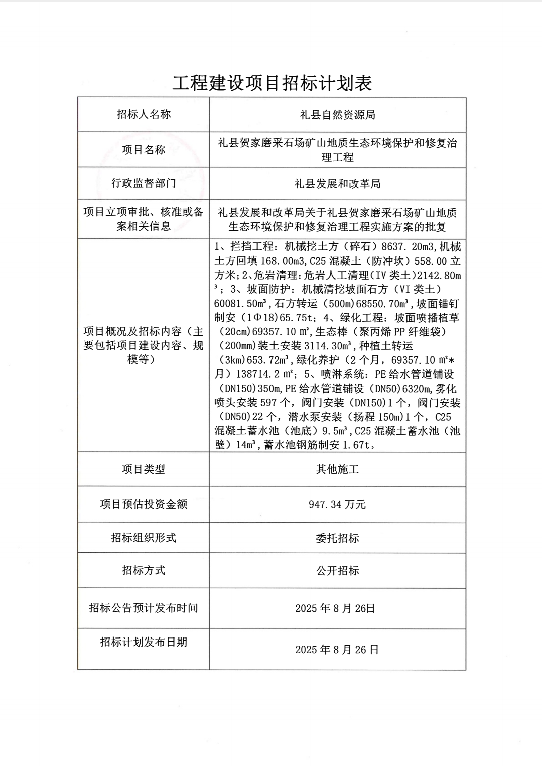禮縣賀家磨采石場礦山地質(zhì)生態(tài)環(huán)境保護(hù)和修復(fù)治理工程
