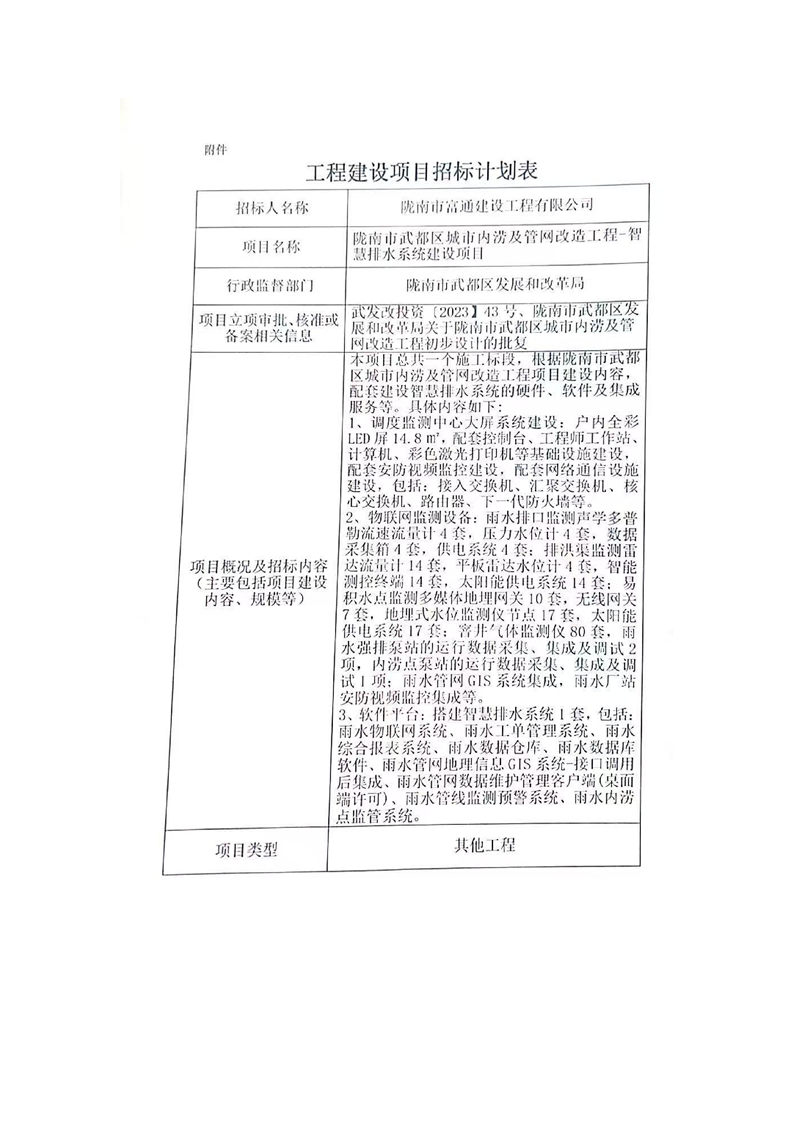 隴南市武都區(qū)城市內(nèi)澇及管網(wǎng)改造工程-智慧排水系統(tǒng)建設(shè)項(xiàng)目