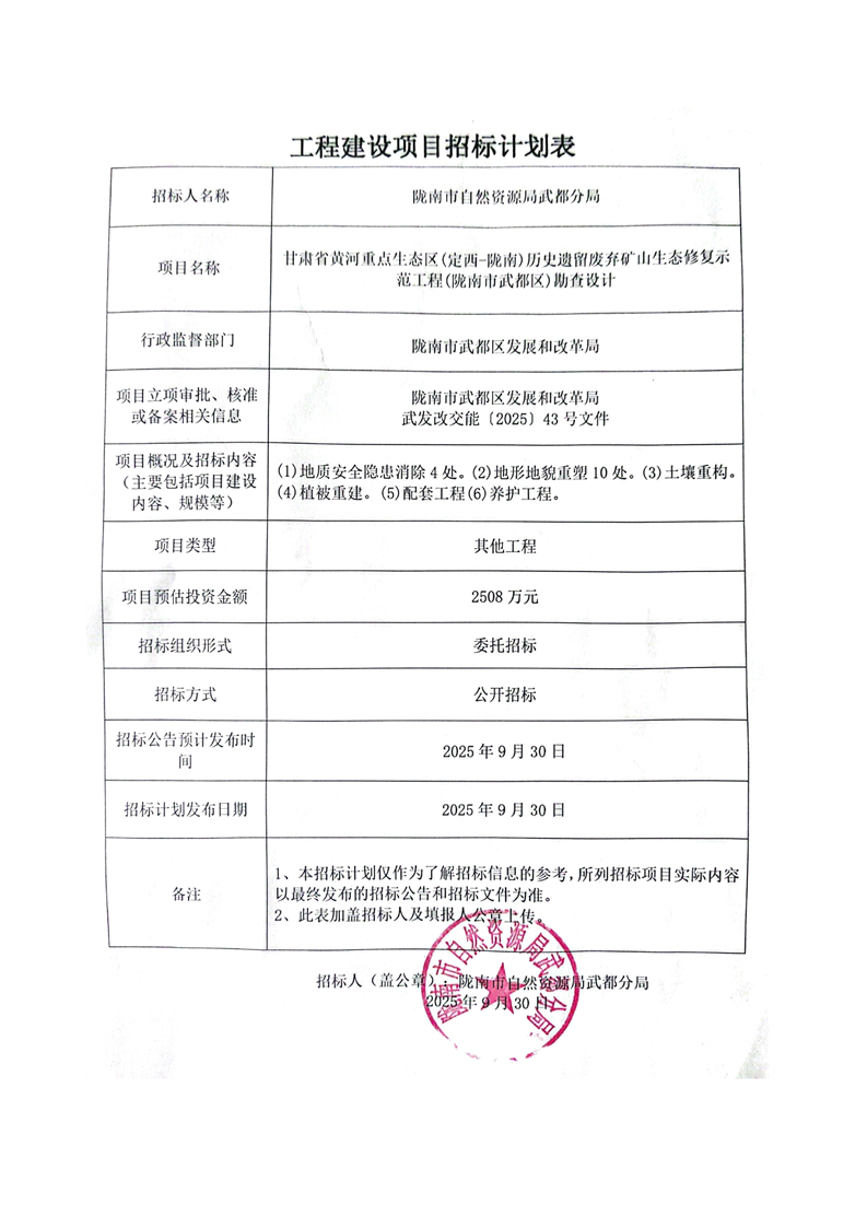 甘肅省黃河重點生態(tài)區(qū)(定西-隴南)歷史遺留廢棄礦山生態(tài)修復(fù)示范工程(隴南市武都區(qū))勘查設(shè)計