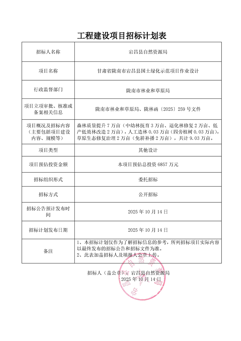 工程建設(shè)項目招標計劃表甘肅省隴南市宕昌縣國土綠化示范項目作業(yè)設(shè)計.pdf