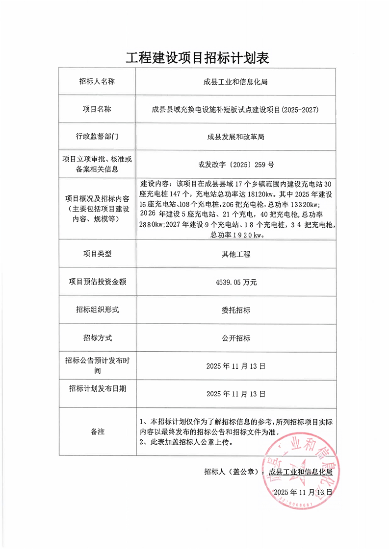 成縣縣域充換電設施補短板試點建設項目(2025-2027)