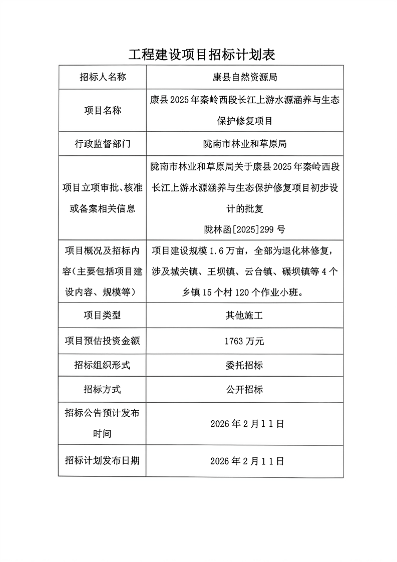 康縣2025年秦嶺西段長(zhǎng)江上游水源涵養(yǎng)與生態(tài)保護(hù)修復(fù)項(xiàng)目