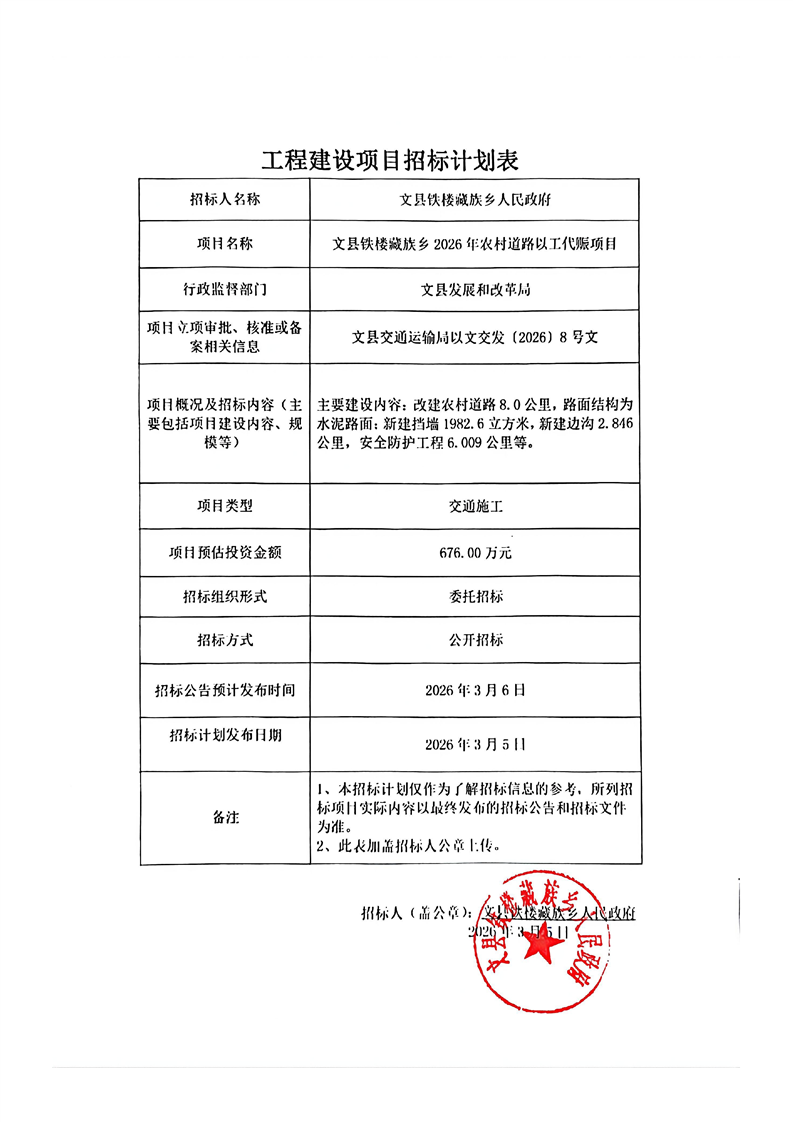 文縣鐵樓藏族鄉(xiāng)2026年農(nóng)村道路以工代賑項(xiàng)目